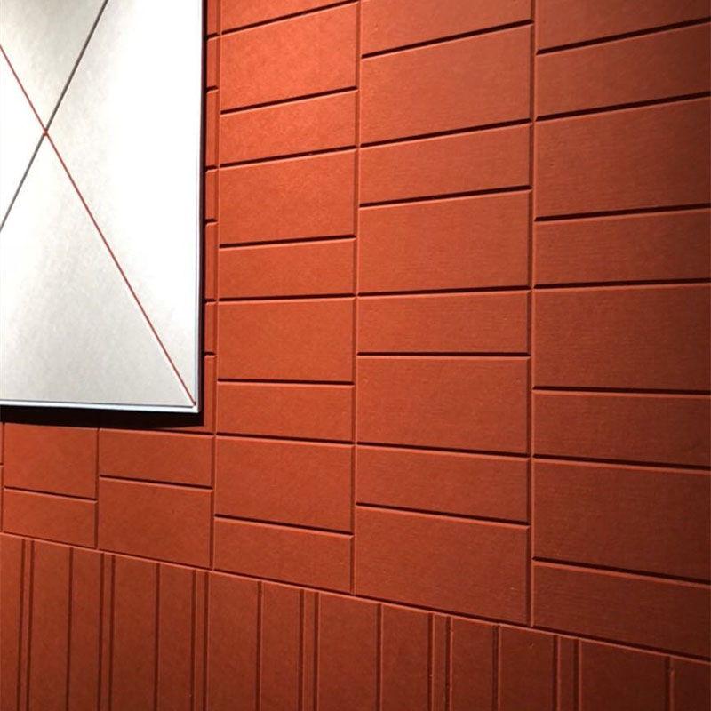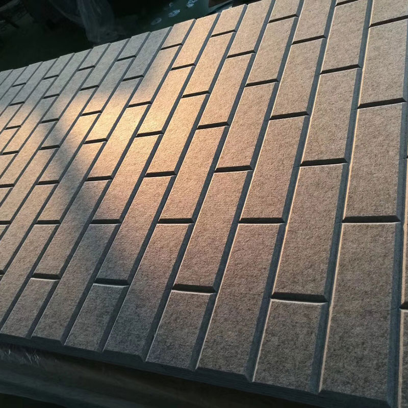 Akustisk panel av polyesterfiber är gjord av 100 % polyester genom nålstansning. Produktionsprocessen är helt fysisk & miljövänlig, inget avloppsvatten, utsläpp, avfall,. inget lim, den porösa karaktären hos den akustiska panelen gör den ljudabsorberande och värmeisolerande med egenskaper av icke-toxisk, icke-allergiframkallande, icke-irriterande och innehåller inte formaldehydbindemedel och har hög NRC: 0,85